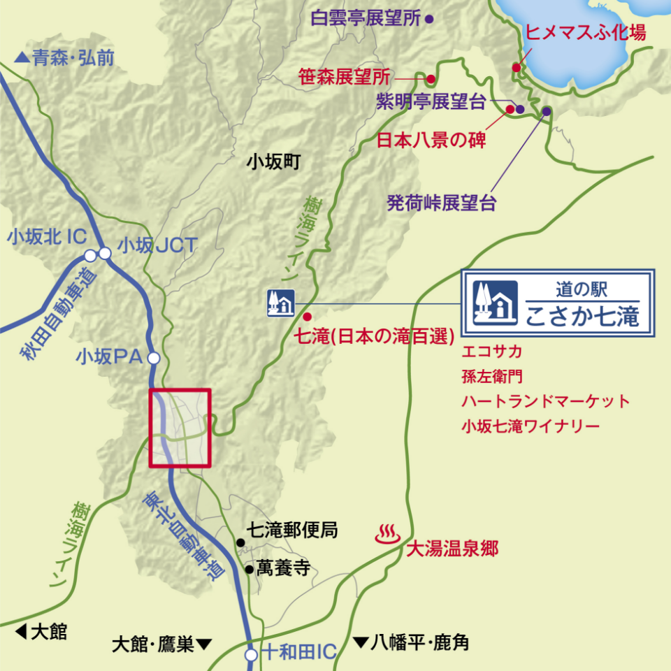 十和田湖と小坂町のちょうど中継地点にあたる、おすすめの寄り道スポット。小坂町自慢のうまいものと見どころが、ぎゅっと揃っています。産直センターやお食事処のほか、敷地内には搾油工場を見学できる『菜種油エコサカ』や、小坂町産のブドウで醸造を行う『こさか七滝ワイナリー』、七滝までの散策なども楽しめます。