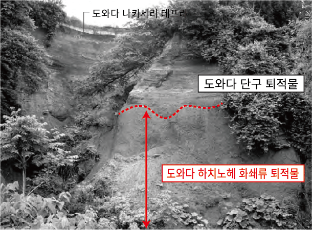 도와다 하치노헤 화쇄류 퇴적물의 지층이 보이는 절벽.