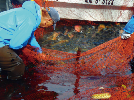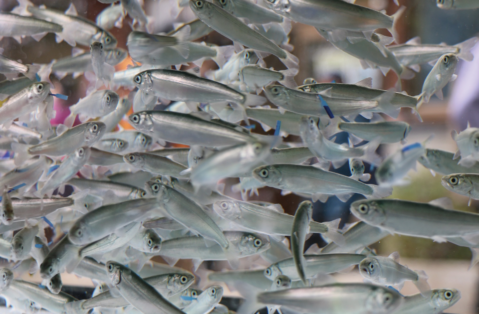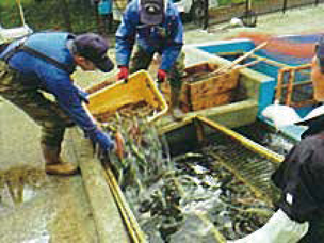 ◎치어의 지느러미는 각 개체가 태어난 해를 식별하기 위해 5년 주기로 절제합니다.