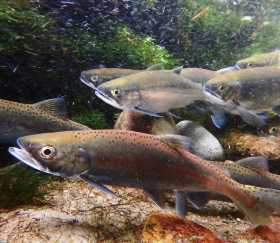 ◎치어에서 성어로 성장한 각시송어는 산란을 위해 무리를 지어 부화장으로 돌아옵니다.
