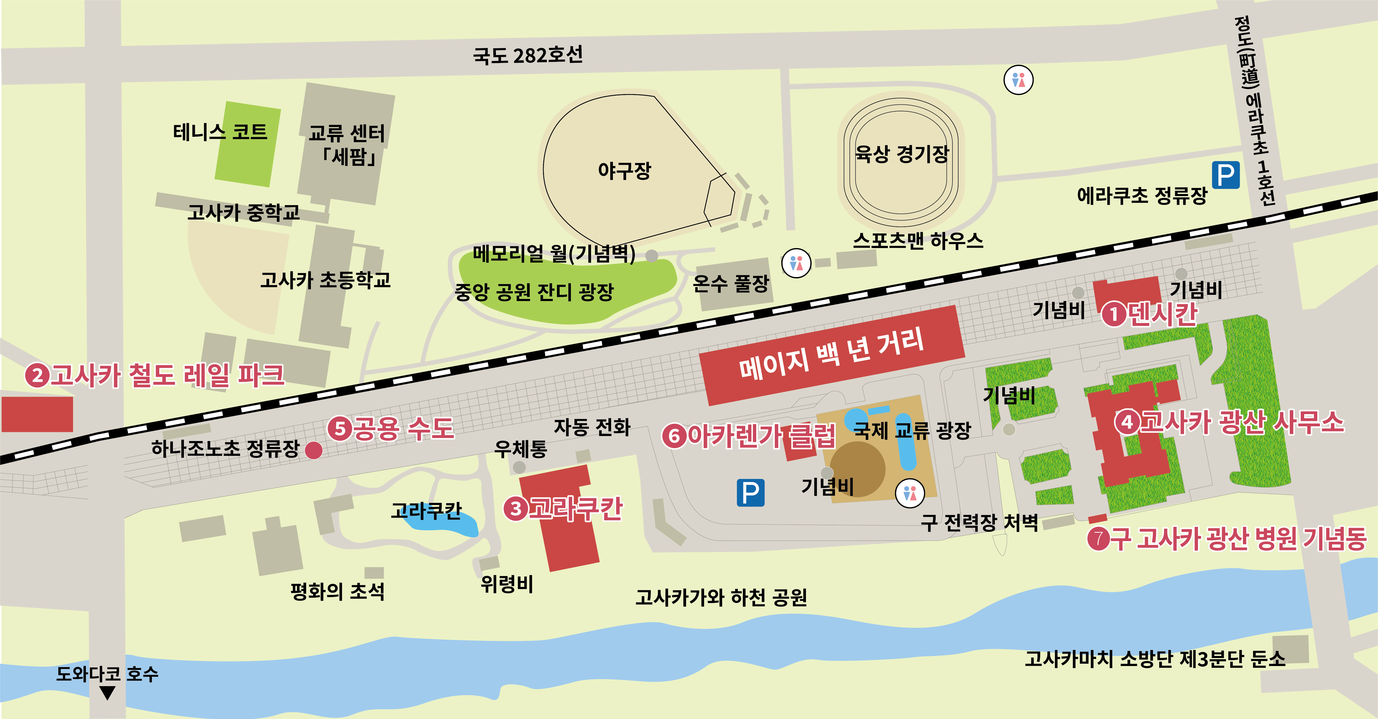메이지 시대부터 고사카 광산의 번영과 함께 쌓아 올려진 고라쿠칸과 고사카 광산 사무소 등 근대화 산업 유산군 외에도 철도 유산을 활용한 「고사카 철도 레일 파크」가 줄지어 있어서 메이지의 고풍스러우면서도 모던한 경관을 즐기실 수 있습니다. 또한, 6월에는 흰 아카시아꽃이 만개하여 메이지 백 년 거리 전체가 달콤한 향기에 휩싸입니다.