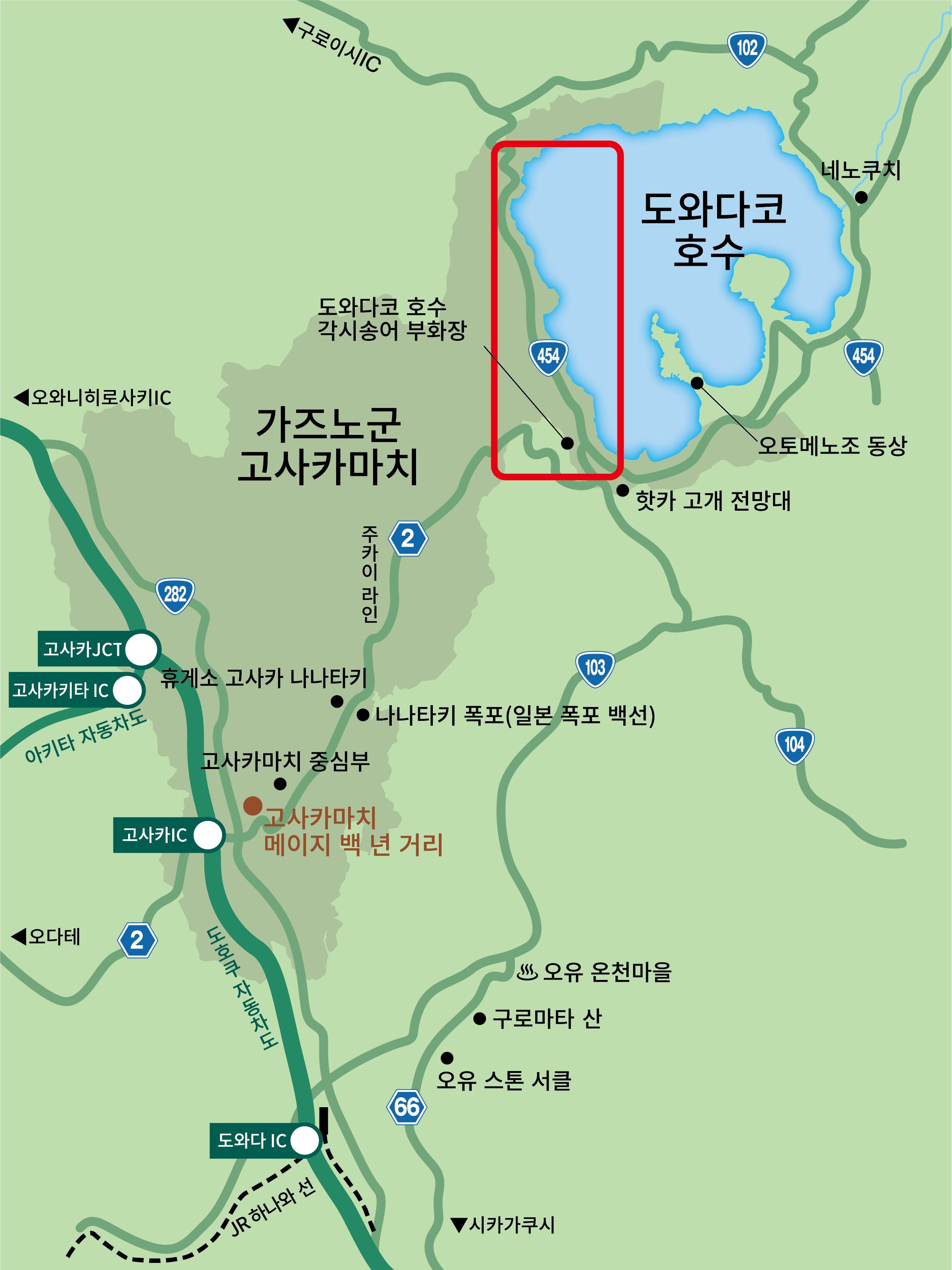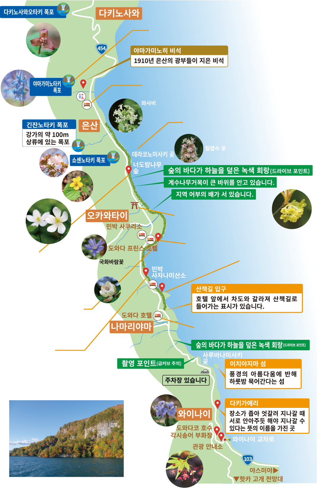 도와다코 호수 서쪽 호반의 호안선에는 조용한 파도소리를 들으면서 한적하게 산책을 할 수 있는 총길이 5 ㎞의 자연 산책길이 마련되어 있습니다. 도와다코 호수를 기분 좋게 바라볼 수 있는 이 길에는 원시림이 펼쳐져 있고, 역사를 느낄 수 있는 명소들이 곳곳에 있습니다. 눈이 녹으면 피는 국화바람꽃과 남바람꽃의 작은 길에서 시작해, 상쾌한 신록, 타는 듯한 단풍의 회랑을 걸으며 계절마다 달라지는 표정을 만끽할 수 있습니다. 서쪽 호반만이 가진 자연 속에서 크게 심호흡 하세요.