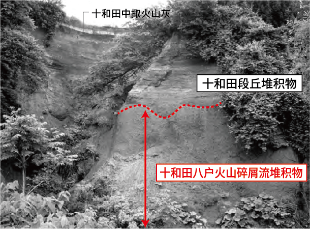 这是能够看到十和田八户火山碎屑流堆积物地层的悬崖。