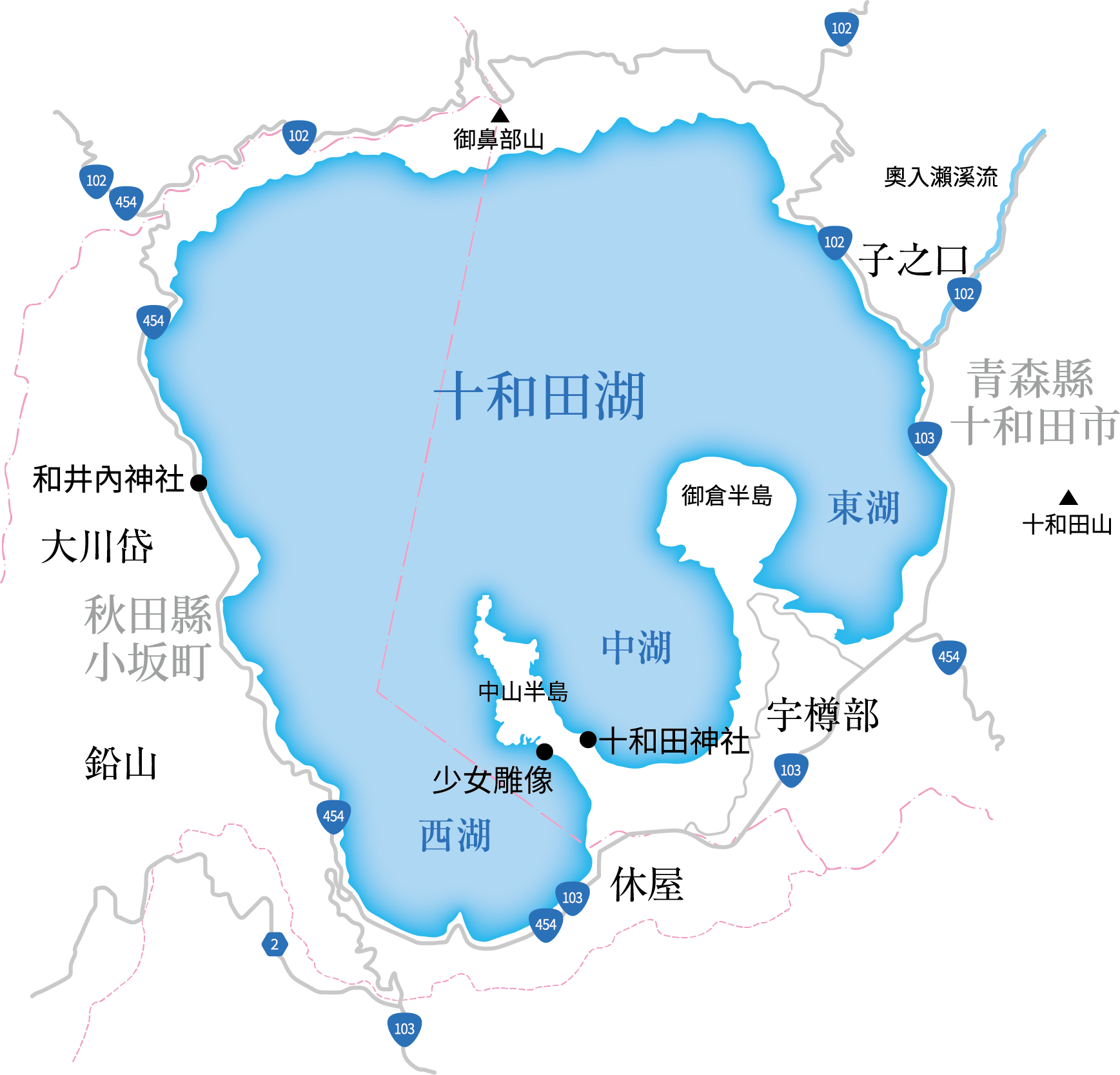 是一個橫跨秋田縣鹿角郡小坂町與青森縣十和田市的湖泊。方圓44㎞,湖水面積61.1㎢,大小位居日本第12位,水深326.8m,水深位居日本第3位,僅次於田澤湖、支笏湖。除了十和田八幡平國立公園以外,還被指定為日本國家特別名勝和天然紀念物。