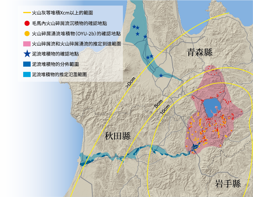 最新的一次噴發發生在平安時代(公元915年)。是日本歷史上最大的噴發。噴煙高高升起,輕石飛落堆積在廣闊範圍,火山碎屑還流到達了約20km遠的地方。近年來,透過地質調查和遺蹟發掘等,揭示了該噴發從開始到結束的情況。大規模噴發反覆發生,在火山碎屑流堆積物、輕石及火山灰大量堆積的地方,可認為其後的雨導致大規模的泥流流到日本海。這個「毛馬內火山碎屑流」除了在十和田火山周邊以高溫流下外,火山泥流還在大湯川和米代川引發了大洪水淹沒沿岸人家等災害。