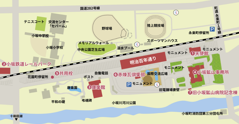明治時代から小坂鉱山の繁栄とともに築き上げられてきた康楽館や小坂鉱山事務所などの近代化産業遺産群のほか、 鉄道遺産を活用した「小坂鉄道レールパーク」が建ちならび、明治のレトロモダンな景観が楽しめます。また、6月にはアカシアの白い花が満開になり、明治百年通り全体が甘い香りに包まれます。